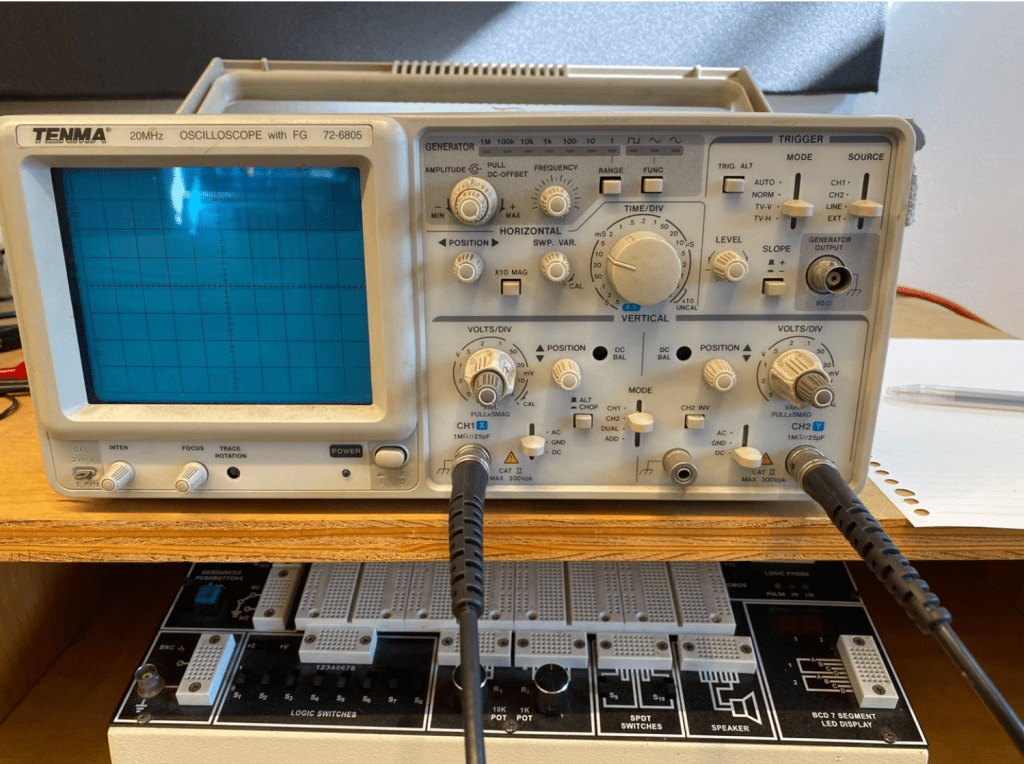 The first thing you should do when using a oscilloscope is turning it one by pressing the button on the bottom left. There are two channels that are able to be connected to you circuit on the scope. The probs on the left of the scope is the first channel and the one on the right is the second channel. On each channel there is a knob that says voltage division. This lets you change the unit of the voltage division on the scope’s screen where the wave appears. This is the Y- axis of the scope. The X-axis of the scope is the time division knob. This knob lets you view a smaller or larger range of waves. There are also two position knobs on each channel that can shift the mid point of the wave. This lets you view the two channels at the same vertical starting point. While using the scope, the power should always be set to DC power. Lastly, on the top section of the scope there is a trigger section. On this section you are able to make the wave actually show up on the scope. This is usually set to Mode to Auto.